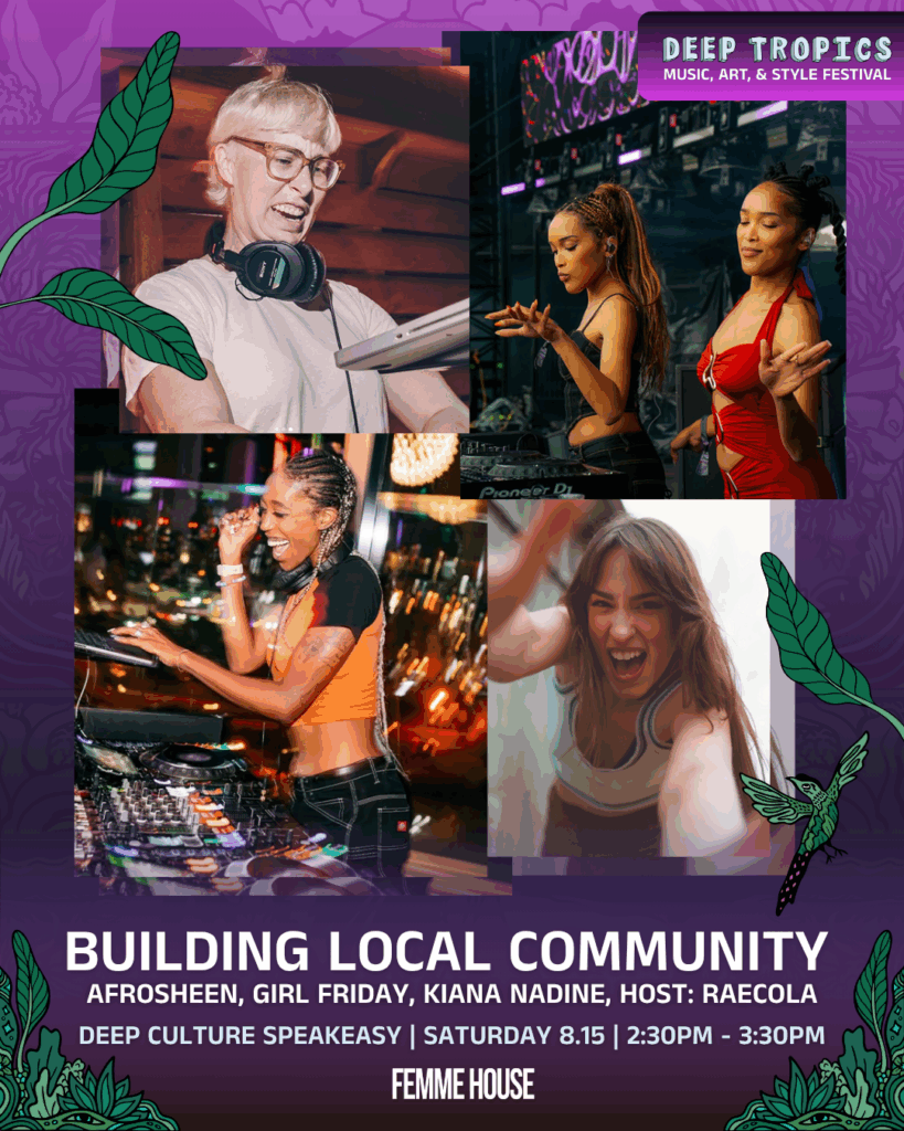 The sustainability programming continues during the festival weekend with Deep Tropics and FEMME HOUSE partnering to curate two onsite panels that celebrate and uplift both local and global voices in the music industry. These panels not only create space for important conversations but also align directly with Deep Tropics’ mission to build an inclusive and environmentally conscious community.