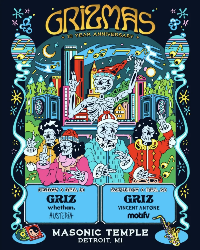 Another thing for fans to get excited about is the new GRiZMAS merch line. Some items are online-only, while others are exclusive to the GRiZMAS Workshop Pop-Up in Detroit. A few special pieces can only be snagged at the Masonic Temple concerts. On top of that, a charity auction will feature one-of-a-kind prizes, including a signed GRiZ saxophone, special edition merch, signed prints, and more. Bids can be placed online or in-store, with winners announced on December 21st.
