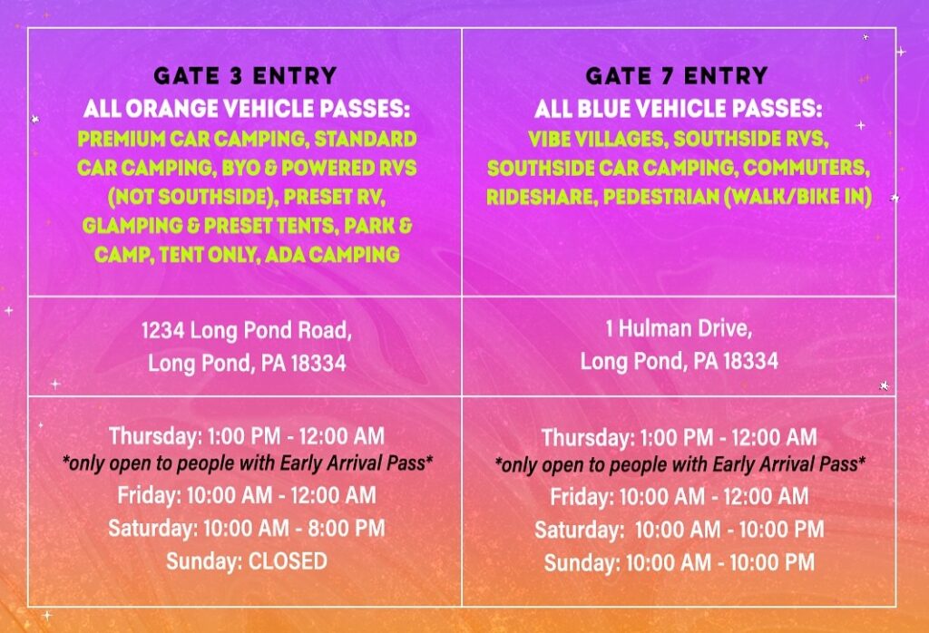 All Orange Vehicle Passes should use the address: 1234 Long Pond Road, Long Pond, PA 18334 and enter at Gate 3. This includes standard and premium car camping, most RVs (not Southside or Vibe Village), glamping, presets, ADA, and tent only. Hours start at 1pm on Thursday with the added early arrival pass, then at 10am on Friday and Saturday.