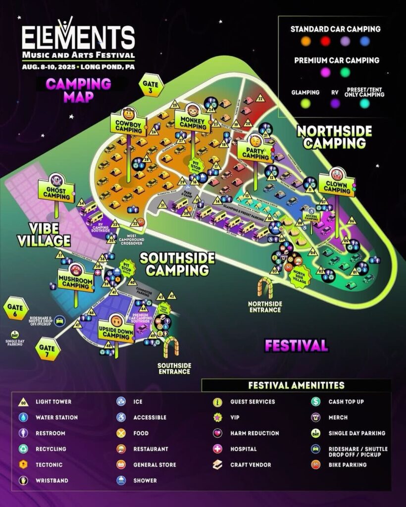 Elements 2025 will be bigger and better than ever, boasting an expanded festival grounds with much better markers and signage for navigating the campgrounds. Check out the new placement of the Water Stage and expanded production and installations in the woods by the air stage.