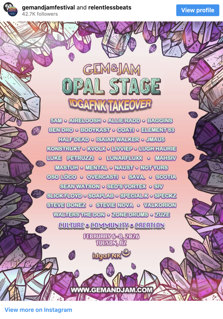 Arizona’s Relentless Beats hosted the festival this year, after its 2025 postponement following failure to secure a lineup. This year, it partnered with idgaFNK to carefully curate Gem & Jam’s Opal Stage to showcase Phoenix’s local EDM scene.
