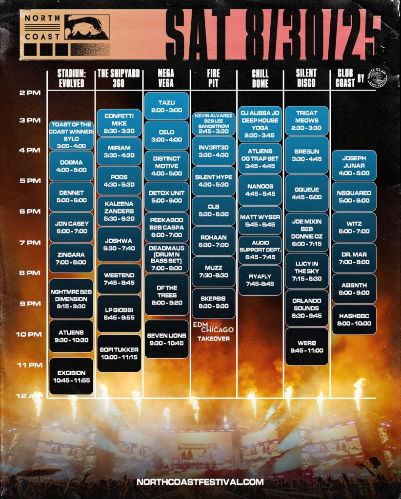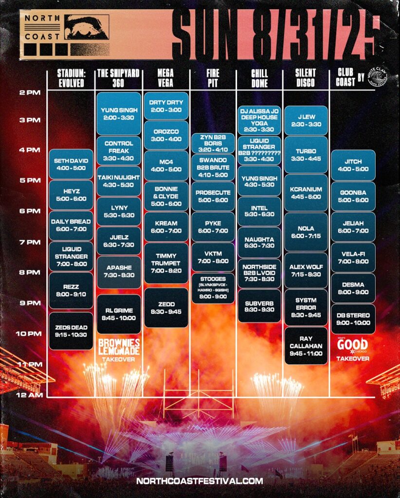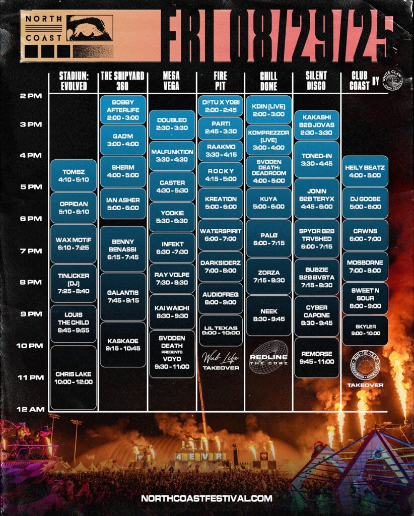 In addition to the official North Coast Afterparties, they have also revealed the set times for all three days of the festival. Friday kicks off with performances from Louis the Child, Tinlicker DJ set, Yookie, Infekt, Ray Volpe, and many others. Closing down the night will be Chris Lake from 10:00 PM – 12:00 AM at Stadium: Evolved, Kaskade from 9:15 PM – 10:45 PM at The Shipyard 360, SVDDEN DEATH VOYD set from 9:30 PM – 11:00 PM at the Mega Vega, and Remorse from 9:45 PM – 11:00 PM at Silent Disco.