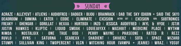 Sunday is all about the b2bs, as the feature attraction of dubstep titans Excision and Subtronics share the stage for what will likely be the closing set at the Prehistoric Stage. Another b2b sure to draw big crowds will be Dab The Sky, the collaboration of Dabin and Said The Sky. Don’t sleep on Witching Hour, the joint project of long-time leaders for ladies in bass, Vampa and Jeanie. Two more ladies triggering our radar in 2025 are Alleycvt and Jessica Audiffed. Finally, Deadroom and Stumpi might not be household names, but that’s because they are the alter-ego side projects of Svdden Death and Wooli, respectively.