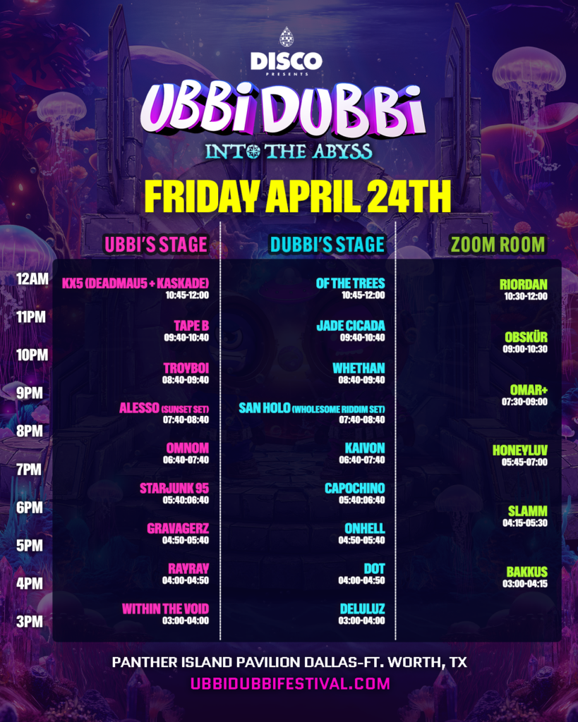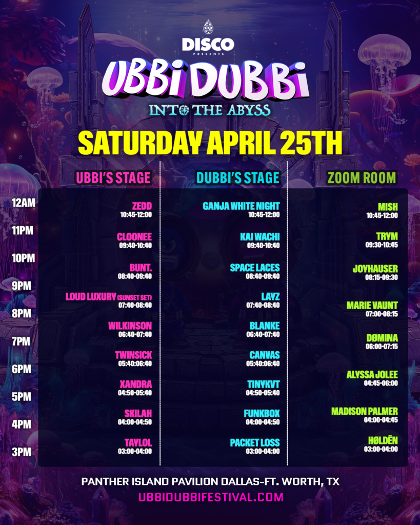 With less than two weeks remaining, Disco Presents’ Ubbi Dubbi Festival is gearing up for its seventh edition, plunging deep into the abyss April 24th and 25th, 2026. Combining immersive production with one of the most extensive, multi-genre line-ups yet, Into The Abyss transforms Panther Island Pavilion into a glowing underwater landscape. You may be wondering where to begin in this bioluminescent world of bewonderment? Fear not, my little barnacle, in this guide, we will usher you to every pinnacle moment of this translucent water world.