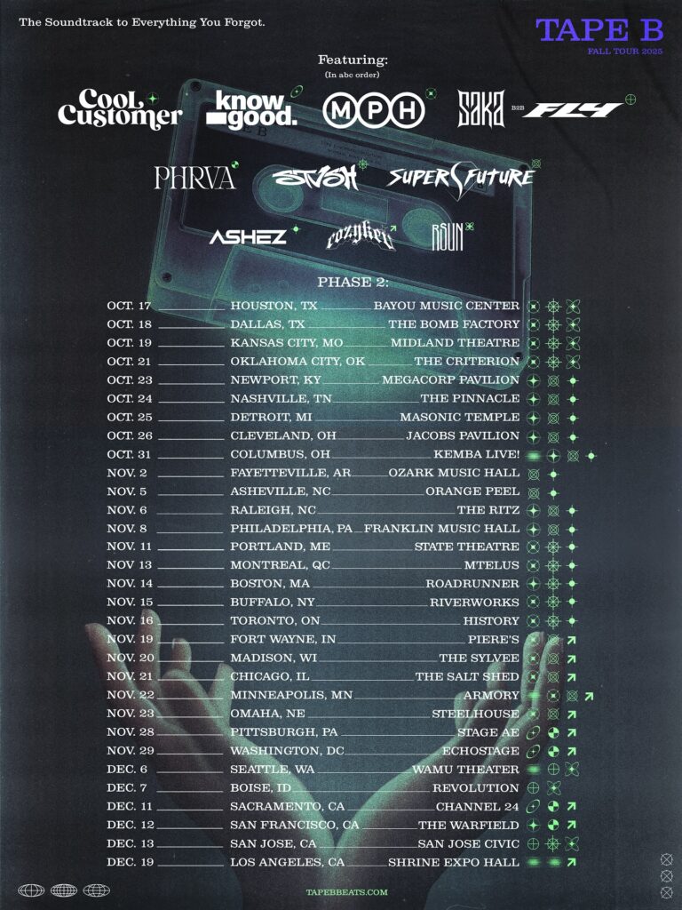 If you weren’t able to catch “Back to Black” at Lost Lands this year, don’t worry – Tape B isn’t slowing down anytime soon. Having recently announced Phase 2 of “The Soundtrack to Everything” tour, he has shows planned through December 19, with stops in Texas, Oklahoma, Tennessee, New York, California, and more. This insane run of shows will feature support from Cool Customer, know good, MPH, Saka B2B Fly, PHRVA, STVSH, Super Future, Ashez, cozykev, and RSUN. See where Tape B is headed next in the image below, and follow his socials to stay updated on new music and show announcements!